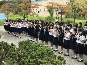 本校も毎年、10月に家庭から1輪の花を持ち寄り、マリア様にお供えして