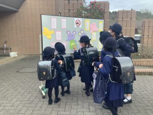 桜が満開の中、元気に笑顔にそわそわしながら子供たちが登校していきました。