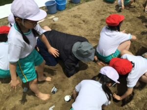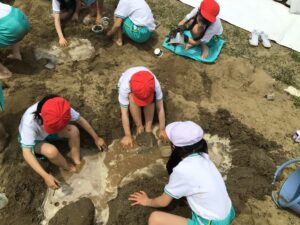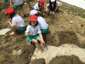 山を作って、川を作って、トンネルを掘って。「足湯!」『泥パック!」なんて声もあちこちから上がっていました。子どもたちの発想がどんどん広がります。