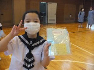 1年生「え~これな~に~?」 6年生「れんらくちょうのカバーだよ。みんなで手作りしたから大切に使ってね。」