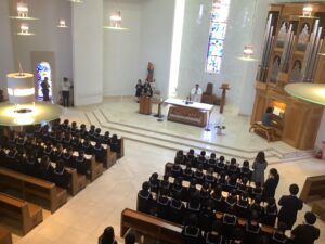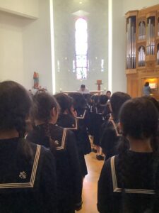 今日は、「こどもの日祈りの集い」。400人ほどが入れる学園の聖堂に集まり、神父様から祝福を受けました。全校生が一堂に集まり、身の回りや世界の人々に思いを馳せ、思いやりの心を向けたり感謝の気持ちを想うことは、本校にとって大事なひと時です。私たちは一人では生きていけません。必ず誰かのお世話になっています。そのことをいつも忘れないようにしたいものです。
