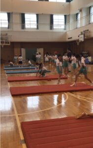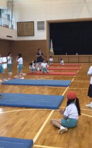 台風が心配な一日となった今日、体育館では4年生がマット運動の練習をしていました。