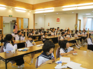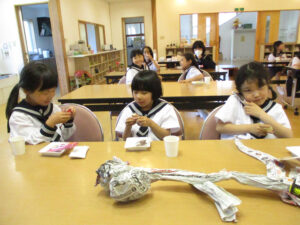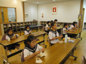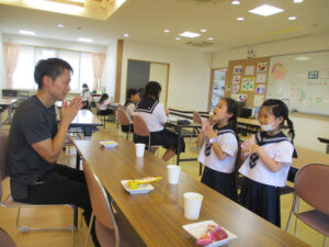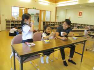 おやつタイム。担任の先生が遊びに来てくれました。