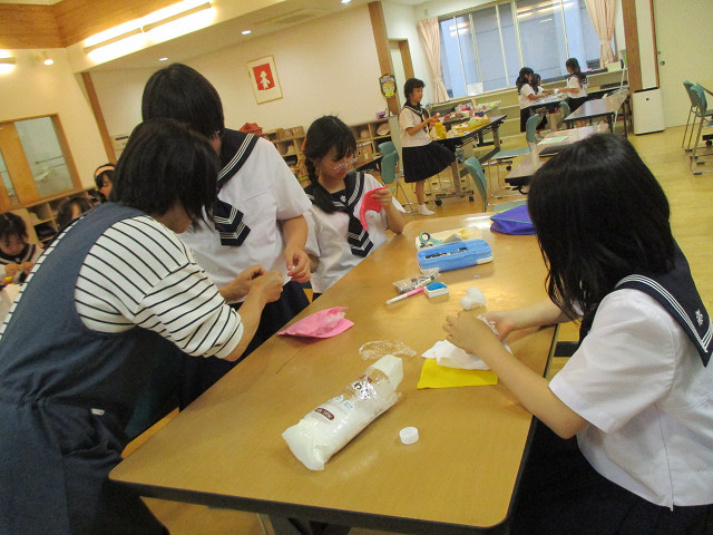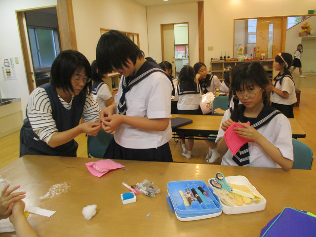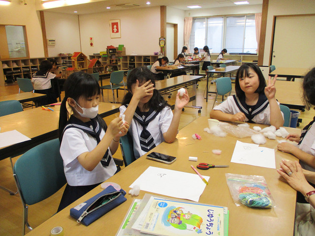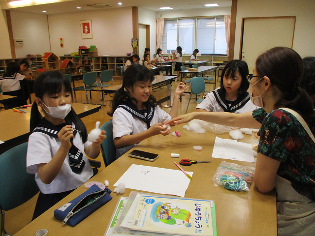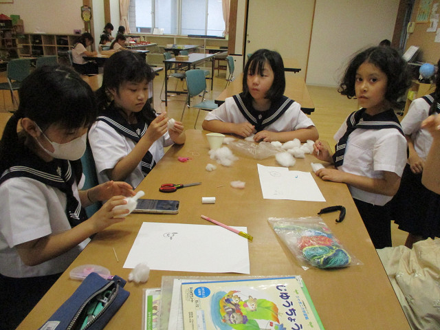 低学年はつまようじで綿をチクチク。