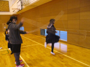 大縄で二人跳び。