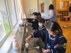 次に、ハンカチを出して手を洗います。